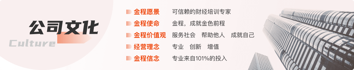 金程教育是一家以財經(jīng)培訓(xùn)為核心的專業(yè)機(jī)構(gòu),將“為國培養(yǎng)人才和傳播知識薪火”作為自己的使命和擔(dān)當(dāng)。秉承“專業(yè)來自101%的投入”的理念,金程教育致力于成為學(xué)員與客戶可信賴的財經(jīng)知識管理專家,打造財經(jīng)教育領(lǐng)域的匠心品牌。