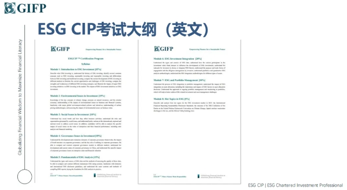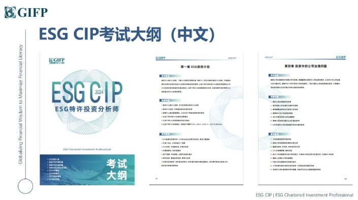 ESG特許投資分析師(ESG CIP,ESG Chartered Investment Professional)是全球金融專業(yè)人士協(xié)會(huì)(GIFP協(xié)會(huì))發(fā)起設(shè)立的,面向ESG投資領(lǐng)域相關(guān)人士的專業(yè)水平鑒定。ESG CIP認(rèn)證圍繞八大模塊展開,主要包括ESG投資介紹、投資中的環(huán)境問題、投資中的社會(huì)問題、投資中的公司治理問題、ESG分析基礎(chǔ)、ESG投資整合、ESG與組合管理以及ESG熱點(diǎn)專題等,對(duì)當(dāng)今ESG投資從業(yè)人員提出了系統(tǒng)的專業(yè)知識(shí)和實(shí)操技能評(píng)價(jià)標(biāo)準(zhǔn)。作為ESG投資領(lǐng)域的專業(yè)水平證書,ESG CIP認(rèn)證被納入全國財(cái)經(jīng)金融專業(yè)人才培養(yǎng)工程。