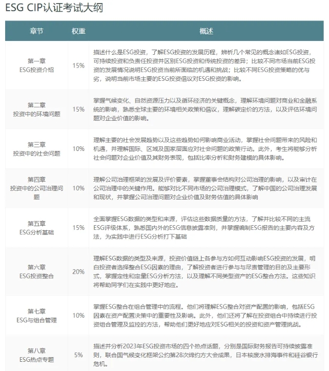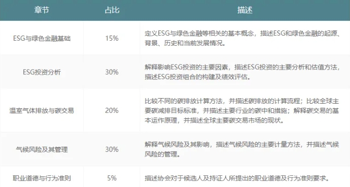 以下是CGFC考綱內(nèi)容,除了ESG分析以外,內(nèi)容還包含了碳中和、溫室氣體、氣候風(fēng)險(xiǎn)等內(nèi)容,屬于廣譜性證書。