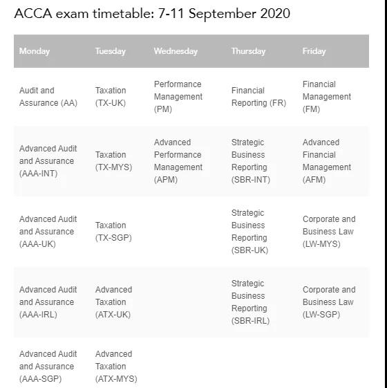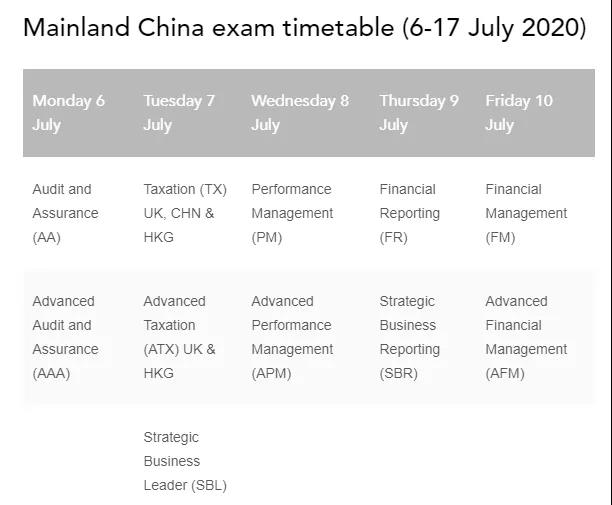 而就在昨天,ACCA正式公布了已延期至7月6日-17日的中國(guó)大陸ACCA考試安排。各科目具體考試時(shí)間安排如下: