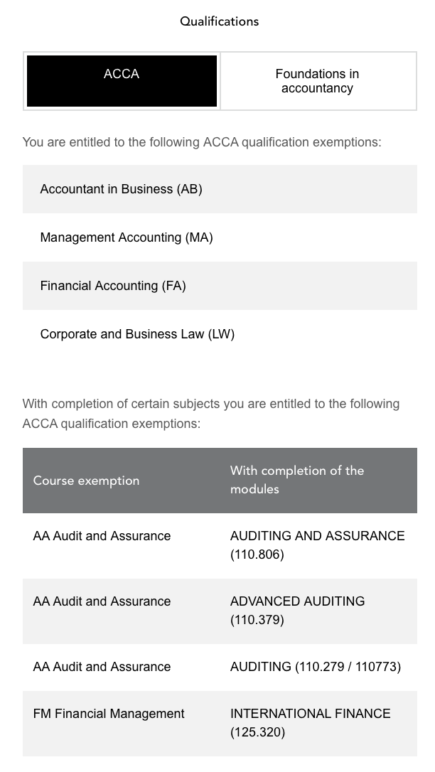 *本文信息來于ACCA官網(wǎng),此表僅供參考,免試結(jié)果由ACCA英國(guó)總部審核確認(rèn)。