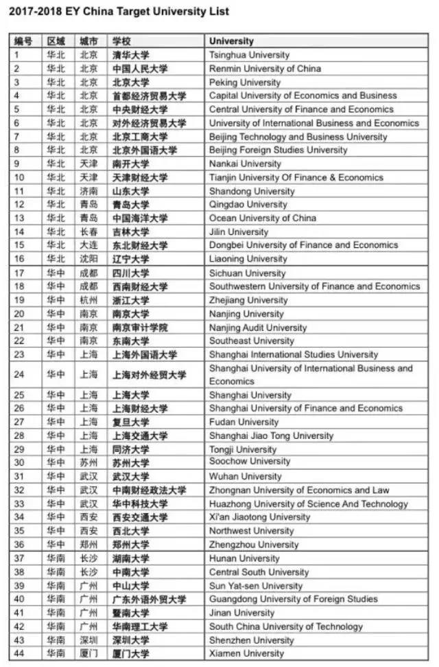 2017-2018年度EY的國(guó)內(nèi)Target School名單,可以作為參考: