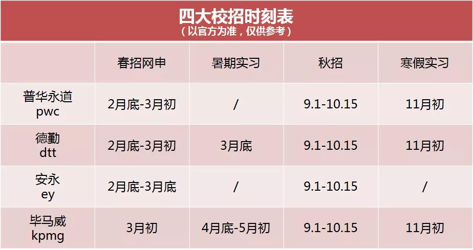 網(wǎng)申時間建議關(guān)注四大的校招公眾號,能夠第一時間內(nèi)收到企業(yè)招聘通知。