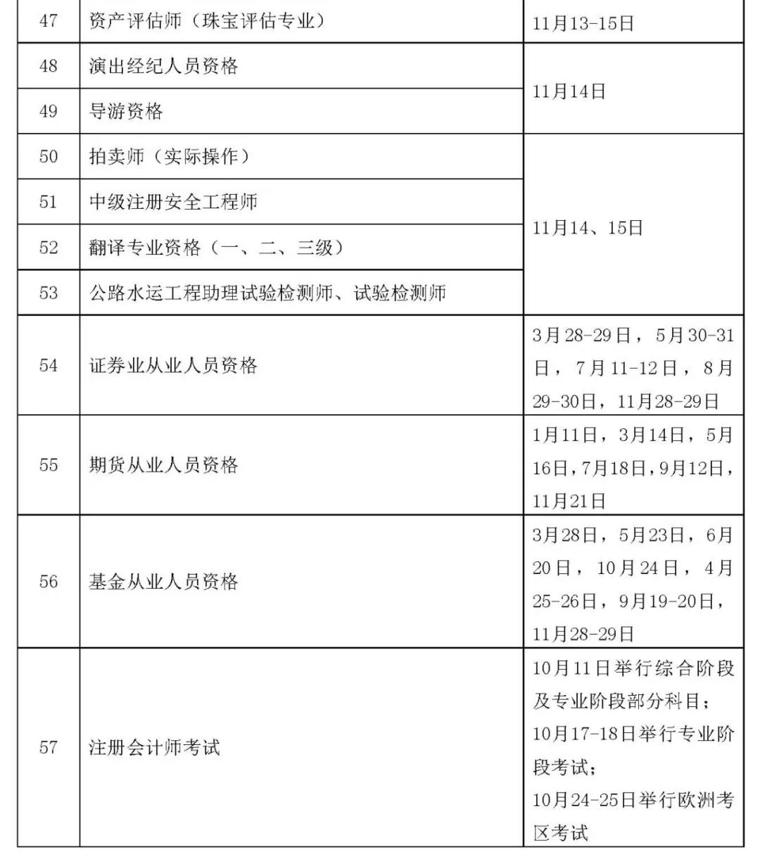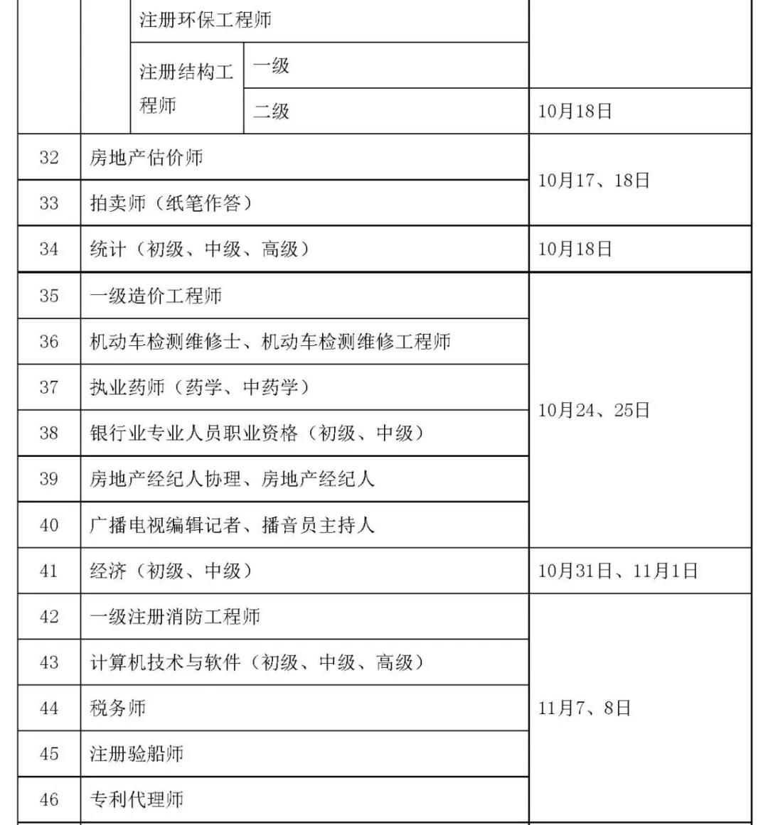 三、教師資格下半年考試,執(zhí)業(yè)獸醫(yī)資格,文物保護(hù)工程從業(yè)資格,認(rèn)證人員職業(yè)資格,特種設(shè)備檢驗(yàn)、檢測(cè)人員資格等具體考試日期由相關(guān)部門另行通知。證券期貨業(yè)從業(yè)人員資格(含基金從業(yè)人員資格)各次考試地點(diǎn)不同,具體安排以相關(guān)行業(yè)協(xié)會(huì)考試公告為準(zhǔn)。專業(yè)技術(shù)人員計(jì)算機(jī)應(yīng)用能力考試日期由各地自行確定。