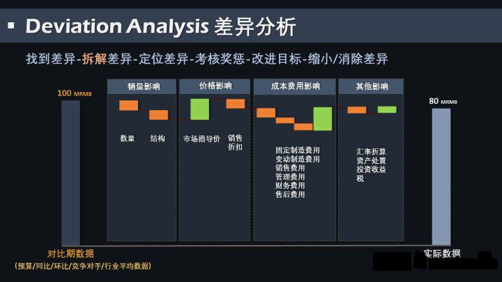 假如我們考核的指標(biāo)是凈利潤,對比期(100)和實(shí)際(80)之間的差異為20,那么顯然,通過這20,我們是無法去進(jìn)行差異定位的,因?yàn)閮衾麧櫟牟町惐澈蟀颂嗟脑?,這之中不乏收入,成本費(fèi)用和其他分別貢獻(xiàn)的差異。
