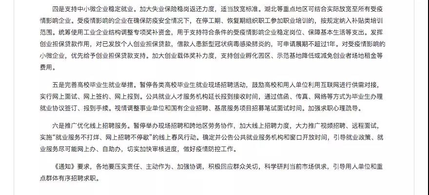2020年畢業(yè)生簽署就業(yè)協議書開始時間推遲到3月1日,結束時間延至12月31日;延長就業(yè)報到、求職創(chuàng)業(yè)補貼辦理時間;視疫情變化情況,適時啟動鄉(xiāng)村教師特崗計劃、鄉(xiāng)村振興協理員招聘工作。