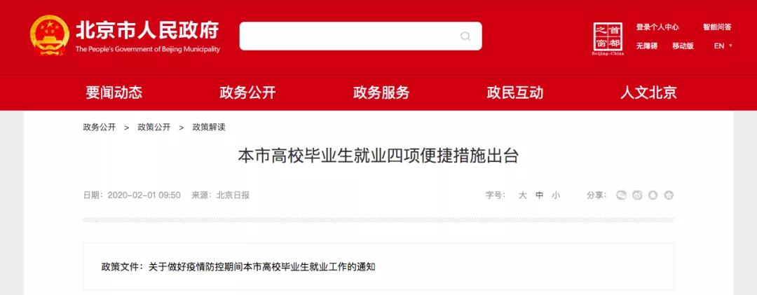 北京市人力社保局與市教委聯合發(fā)布《關于做好疫情防控期間本市高校畢業(yè)生就業(yè)工作的通知》,出臺暫?,F場招聘、鼓勵線上服務、簡化就業(yè)手續(xù)、推遲業(yè)務辦理時間四項高校畢業(yè)生就業(yè)安全便捷舉措。