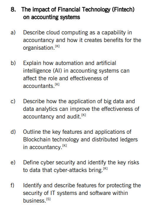 2019-2020年的考綱,新增了Financial technology 的部分,這個需要同學(xué)們注意起來,因為往往新增的部分,是很大幾率上會考到的,那么為什么這次新考綱要新增這個版塊呢,因為隨著科技的發(fā)展,會計角色,審計角色會發(fā)生改變,這種改變可能是顛覆性的。那跟隨大雪老師,一起來看看具體的新增部分的考點內(nèi)容吧。