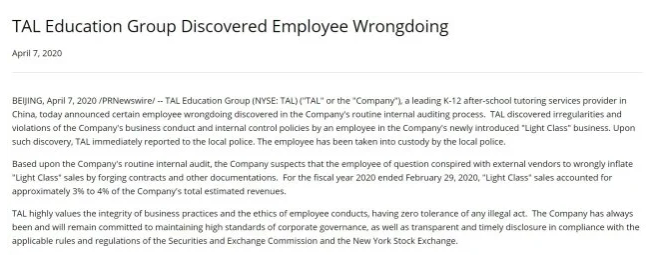 后來就連好未來“公告表示,在公司的例行內(nèi)部審計(jì)中,公司發(fā)現(xiàn)該問題員工與外部供應(yīng)商合謀通過偽造合同及其他文件的方式虛增輕課業(yè)務(wù)的銷售收入。輕課業(yè)務(wù)約占截止2020年2月29日的2020財(cái)年整體預(yù)計(jì)收入的3%-4%。