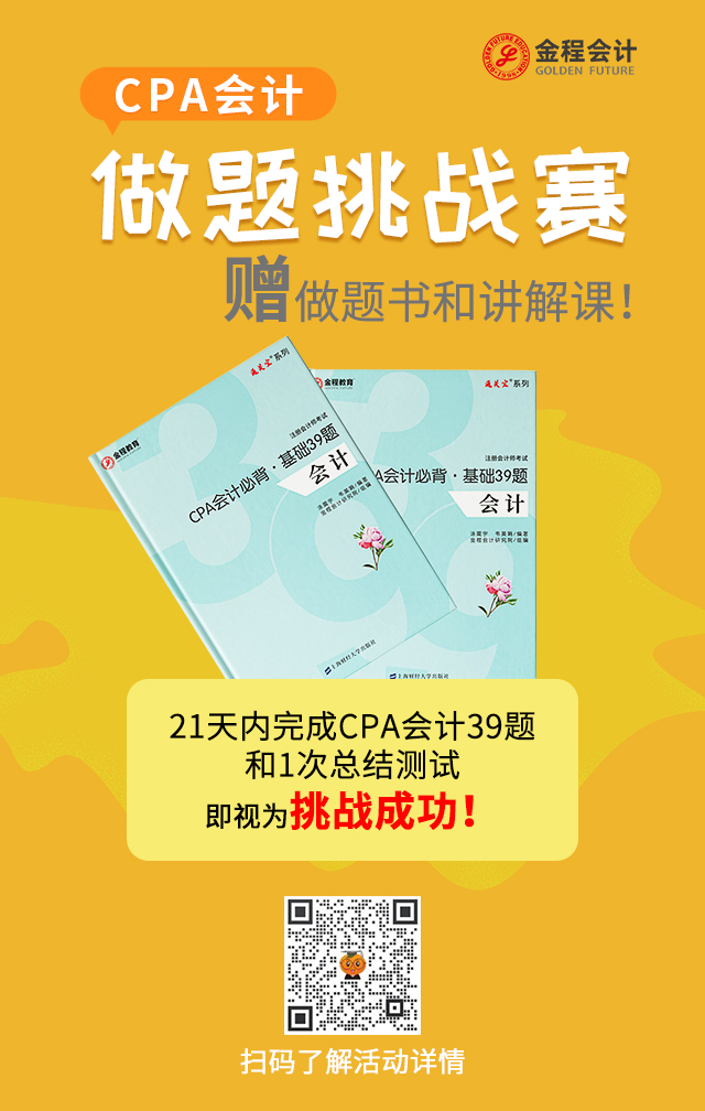 ① 歡迎關(guān)注微信公眾號(hào)“金程CPA”,獲取更多最新資訊和干貨。關(guān)注收藏微信小程序“CPA題庫(kù)大全”隨時(shí)隨地在線(xiàn)做題,查缺補(bǔ)漏!