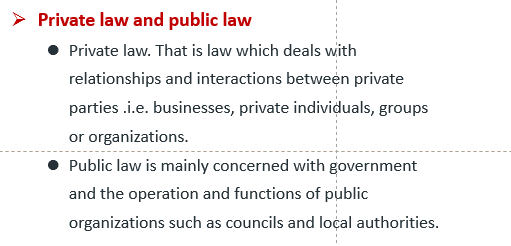 公法調整的內容,主要相關的是一些公權力機關的職能,和利益搭界的就是公法,就是它的一方必須要是公權力,比如我們說的tax law 稅法,administration law 行政法,憲法 刑法