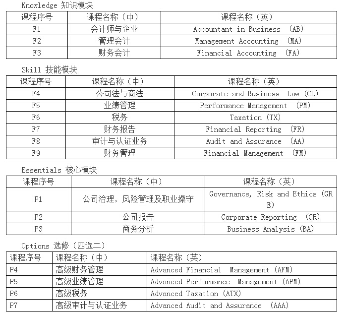 從2007年12月起,ACCA實施新的考試大綱。新大綱充分表達了雇主和專業(yè)人士的意見,反映了現(xiàn)代商務社會對財務人員的要求。在學習過程中使學員全面掌握財務、財務管理、審計、稅務及經(jīng)營戰(zhàn)略等方面的專業(yè)知識,提升分析能力并拓展戰(zhàn)略思維。新大綱共有十四門課程,分為兩個部分,具體科目如下: