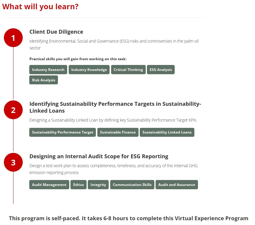 Forage為候選人提供免費(fèi)的開(kāi)放式培訓(xùn)課程。任何候選人都可以參加公司支持的課程,以培養(yǎng)職業(yè)技能、知名度和經(jīng)驗(yàn)。該平臺(tái)運(yùn)行各種虛擬培訓(xùn)課程,合作機(jī)構(gòu)包括畢馬威、高盛、微軟、通用電氣、BCG、摩根大通Chase & Co.、花旗、德勤、埃森哲等。