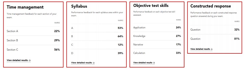 從2022年9月考試季開始,所有選擇應(yīng)用技能科目考試標(biāo)準(zhǔn)卷的考生均可獲取自己的考試表現(xiàn)反饋。My Exam Performance操作平臺(tái)主要分為以下四個(gè)部分的內(nèi)容。