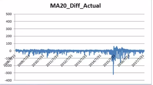 簡單移動平均MA20,也即是過去20天的移動平均的日內(nèi)波動率作為下期的預(yù)測值,R方是34.42%,比機(jī)器學(xué)習(xí)的預(yù)測要少3%左右。