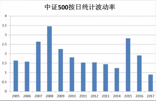如此長時間的低波動率確實在中國市場上不常見。下面我們統(tǒng)計了一下中證500和滬深300指數(shù)分年度的波動率分布情況,可以看到2017年近的波動率確實是處在歷史位的。》》點擊學(xué)習(xí)量化交易策略