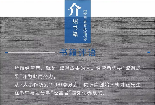 所謂經(jīng)營(yíng)者,就是“取得成果的人。經(jīng)營(yíng)者需要“取得成果”并為此而努力。從2人小作坊到2000家分店,優(yōu)衣庫(kù)創(chuàng)始人柳井正先生在書(shū)中與您分享“經(jīng)營(yíng)者”是如何養(yǎng)成的。本書(shū)幫你拋棄學(xué)生思維,遠(yuǎn)離職場(chǎng)老油條,以經(jīng)營(yíng)者思維成長(zhǎng),走向名企。