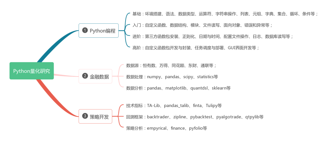 以 Python 為例,為了實(shí)現(xiàn)量化交易三大模塊的操作,除去 Python 的基礎(chǔ)語(yǔ)法學(xué)習(xí),在數(shù)據(jù)方面,還需要學(xué)習(xí)Pandas、Numpy、tushare以及一些爬蟲(chóng)庫(kù)等;在策略分析和執(zhí)行方面,也需要掌握Backtrader、VNPY、TA-lib、Pandas、matplotlib等基礎(chǔ)工具。