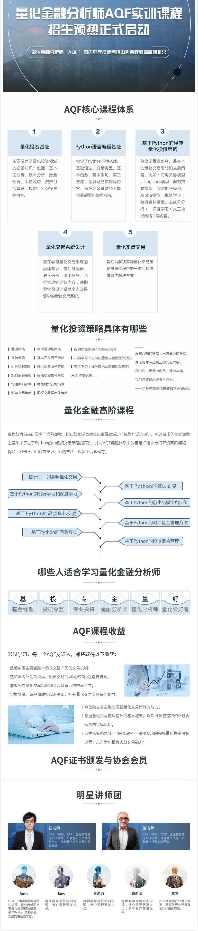 你會的編程語言越多,你能讀的和復現(xiàn)的內(nèi)容也就越多。畢竟量化大佬們的編程偏好不一樣,如果你都會,就不會被這個問題所阻礙。當然最捷徑的方法是報班學習,畢竟如果0基礎(chǔ)可能如何選資料都不會,再加上網(wǎng)上的資料五花八門,很難系統(tǒng)的學習,而報班能夠解決這個問題,如果大家有需要的話,可以來詳細了解一下金程網(wǎng)校AQF量化培訓班,在這能全面了解量化是干什么的,也能了解量化要學習哪些技能等等。>>>點擊試聽了解金融量化AQF培訓課程