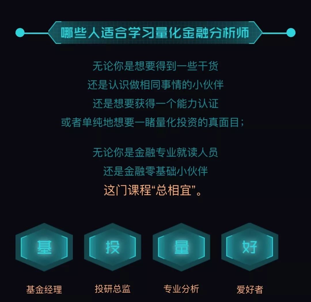 適合本量化投資實訓項目的人群有:有志于學習專業(yè)的量化投資方法,且有志于從事與金融量化分析相關的經(jīng)濟活動或?qū)I(yè)服務工作的人員。相關工作包括:投資顧問、量化投資工程師、量化投資策略研究分析師、行業(yè)研究中的量化分析團隊等。