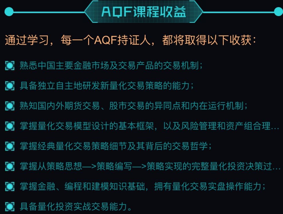 而AQF證書項目旨在為此類人員提供基本理論知識、切實可行的研究方法,提高參訓人員的量化分析水平。>>>點擊試聽量化交易培訓課程