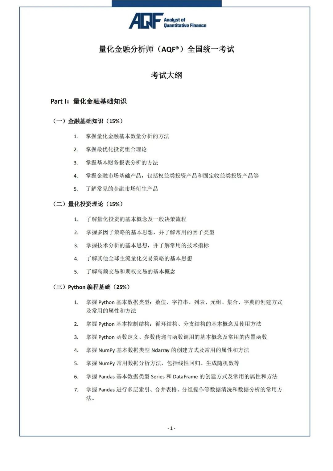 參加量化金融分析師AQF考試的必要條件是在金程網(wǎng)校學(xué)習(xí)指定的AQF課程,主要包括量化投資基礎(chǔ)、量化策略模塊實(shí)戰(zhàn)兩部分。AQF考試時間分為3月、9月兩次考試,目前2022年3月考試因?yàn)橐咔榈脑蛞蜒悠?,具體時間官網(wǎng)還沒公布,大家如果想要報(bào)考,可以先了解一下AQF考試大綱內(nèi)容,具體如下: