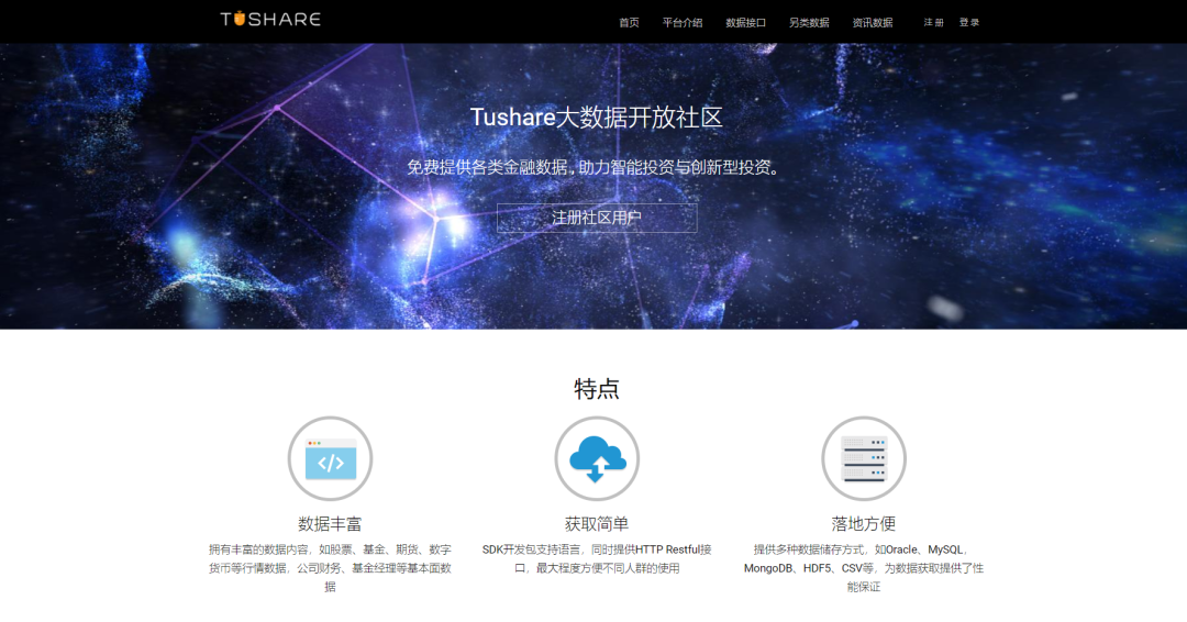 Tushare是一個(gè)比較老牌的數(shù)據(jù)接口,包含滬深股票、指數(shù)、公募基金、期貨、期權(quán)、債券、外匯等非常多的金融數(shù)據(jù),使用接口的方法也非常簡(jiǎn)單,導(dǎo)出數(shù)據(jù)直接是pandas的DataFrame格式,所以非常方便。缺點(diǎn)就是部分?jǐn)?shù)據(jù)需要一定積分才可以獲取,而且比較頭疼的是還會(huì)定期清理積分。我之前好不容易搞到500多積分,前幾天看發(fā)現(xiàn)只剩120了,哭唧唧。