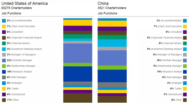 這張表是從CFA Institute的官網上挖下來的,美國和中國的CFA charter們的職業(yè)構成。