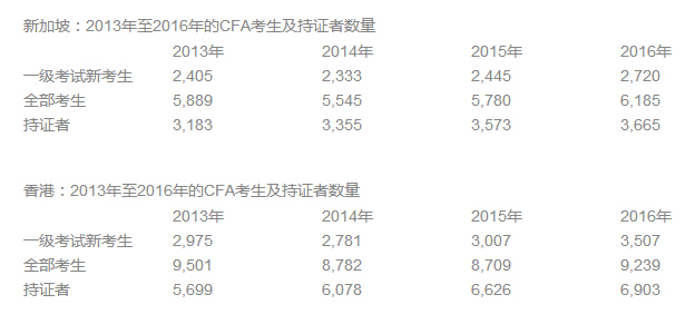這些數(shù)字看來還會繼續(xù)上升,因為CFA被證明越來越受到新考生的歡迎。根據(jù)CFA協(xié)會的數(shù)據(jù),自2013年以來,香港參加CFA一級考試的人數(shù)已經(jīng)從2,975人增加到3,507人,新加坡則從2,405人增加到了2,702人。