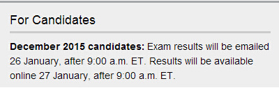 December 2015 candidates: Exam results will be emailed 26 January, after 9:00 a.m. ET. Results will be available online 27 January, after 9:00 a.m. ET.