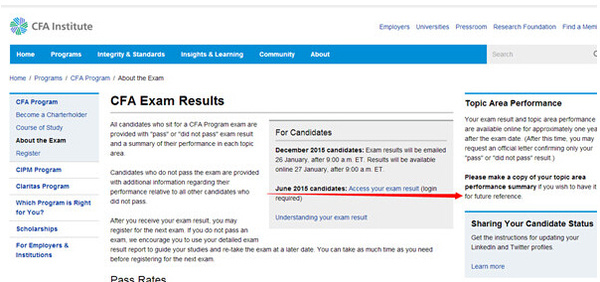 CFA官方通知2015年12月5日的CFA一級考試成績: