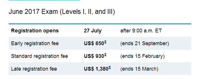 2017年6月CFA考試報(bào)名于2016年7月27日開啟,CFA考生可進(jìn)入CFA協(xié)會官網(wǎng)進(jìn)行報(bào)名,根據(jù)報(bào)名政策,CFA考試越早報(bào)名越優(yōu)惠,考生可在優(yōu)惠階段報(bào)名,即2016年7月27日至2016年9月21日。