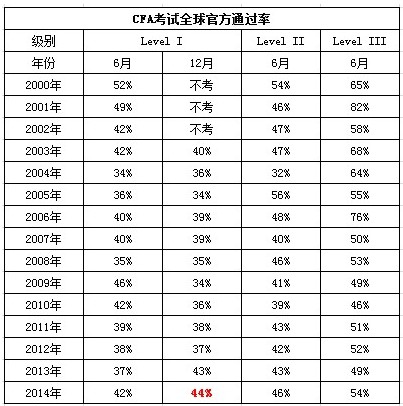 2014年12月CFA一級(jí)全球通過率為44%,同比2014年6月CFA一級(jí)的通過率提升了2個(gè)點(diǎn),同比2013年12月CFA一級(jí)的通過率提升了1個(gè)點(diǎn)