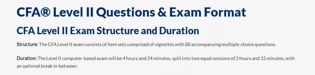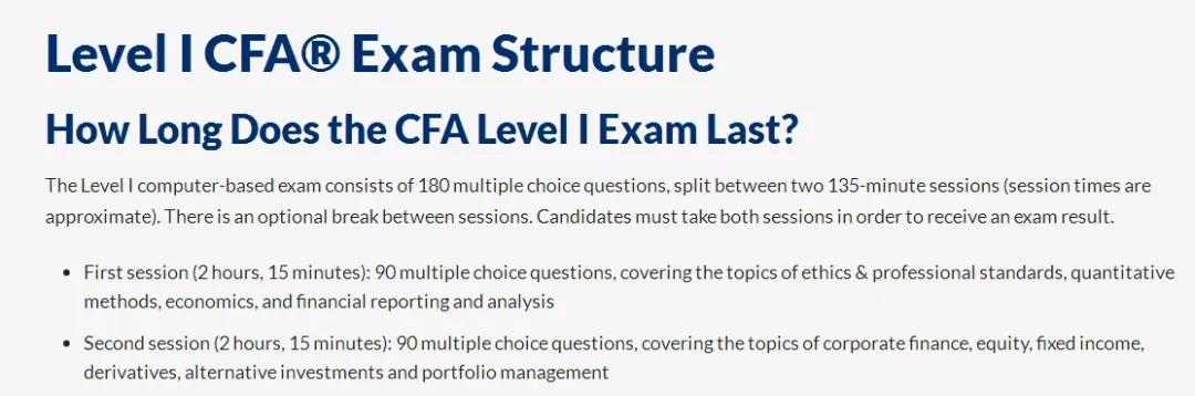 第二場(chǎng)考試(2小時(shí)15分鐘):90道選擇題,涵蓋企業(yè)融資、股票、固定收益、衍生品、另類投資和投資組合管理等主題。