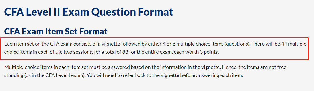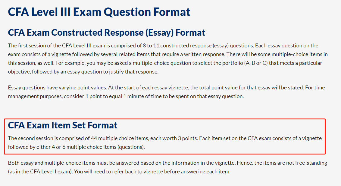 第二部分的題目與CFA二級(jí)考試的題目形式是一樣的,每個(gè)case后會(huì)有4道或6道單選題,單選題目由原來的60道題變?yōu)?4道,每道題目的分?jǐn)?shù)為3分。