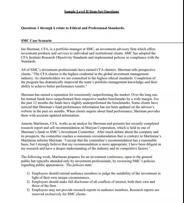 這里有三個案例(道德操守與專業(yè)行為準(zhǔn)則、財務(wù)報表分析、權(quán)益投資各一個案例),共計18道選擇題,作為二級考試樣題。特許金融分析師CFA考試題型樣題僅作參考示例,其中部分內(nèi)容出自往年的課程教材。