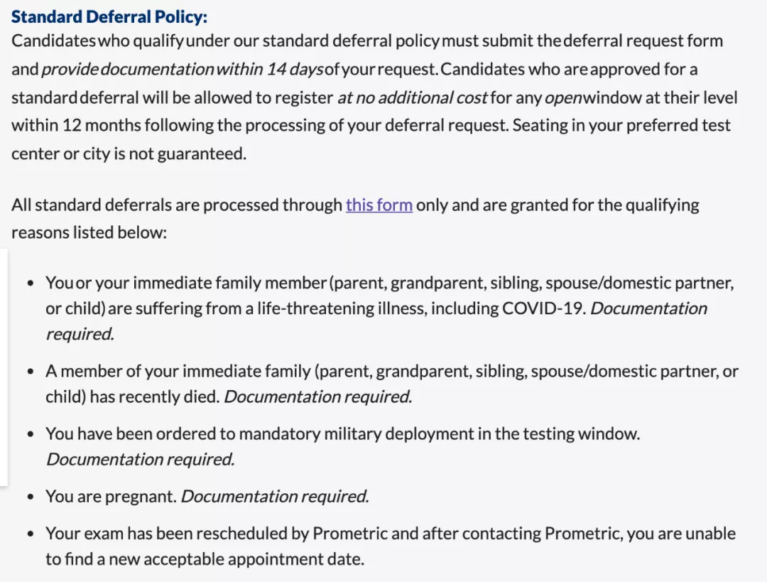 第二:申請(qǐng)非標(biāo)準(zhǔn)延期通過(guò)后,考生最快只能選擇9個(gè)月后的考試,以2月考試為例,假如你選擇了非標(biāo)準(zhǔn)延期,最快只能選擇11月考期的考試了。(協(xié)會(huì)解釋是預(yù)約、更改考試人流量太大,他們需要提前做好準(zhǔn)備)