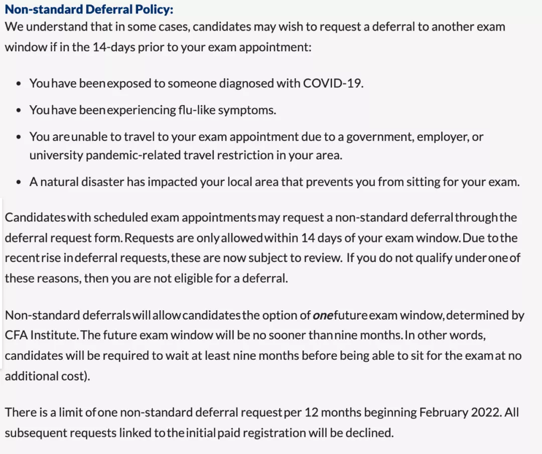 當(dāng)然每個(gè)考期總有小伙伴想延期,目前協(xié)會(huì)是開(kāi)放了標(biāo)準(zhǔn)延期(standard defer),只有滿足條件的才可申請(qǐng)大概率等到1月15號(hào)之后,協(xié)會(huì)就會(huì)開(kāi)放非標(biāo)準(zhǔn)延期,如果屆時(shí)你有出行限制是可以申請(qǐng)非標(biāo)準(zhǔn)延期。