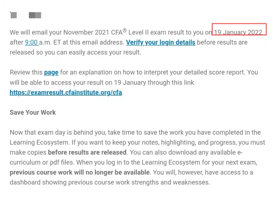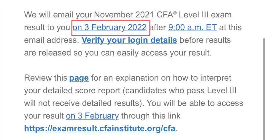 一般cfa官網(wǎng)協(xié)會(huì)的官方說法都是美東時(shí)間9點(diǎn)整出分,這里要注意,現(xiàn)在已經(jīng)切換到了冬令時(shí)(時(shí)差13小時(shí)),折算成北京時(shí)間是當(dāng)天晚上22:00。那說是10點(diǎn)出真的是10點(diǎn)出嗎?那還真不是,有早過也有晚過,前幾年特許金融分析師CFA協(xié)會(huì)是只通過郵件來發(fā)成績(jī),那個(gè)時(shí)候很多人都要等到半夜才能收到郵件。