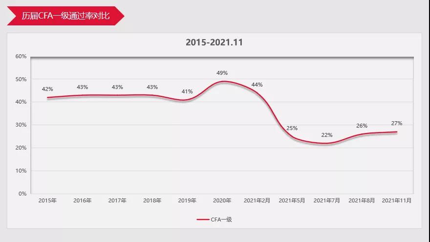 多數(shù)CFA國內(nèi)考生在收到郵件的時(shí)候,除了關(guān)注自己有沒有通過,另外會發(fā)現(xiàn)2021年11月CFA一級的通過率僅為27%。相比7月一級22%的通過率,8月一級26%的通過率來看,2021年11月一級CFA考試的通過率為27%,基本保持持平,變化不大!