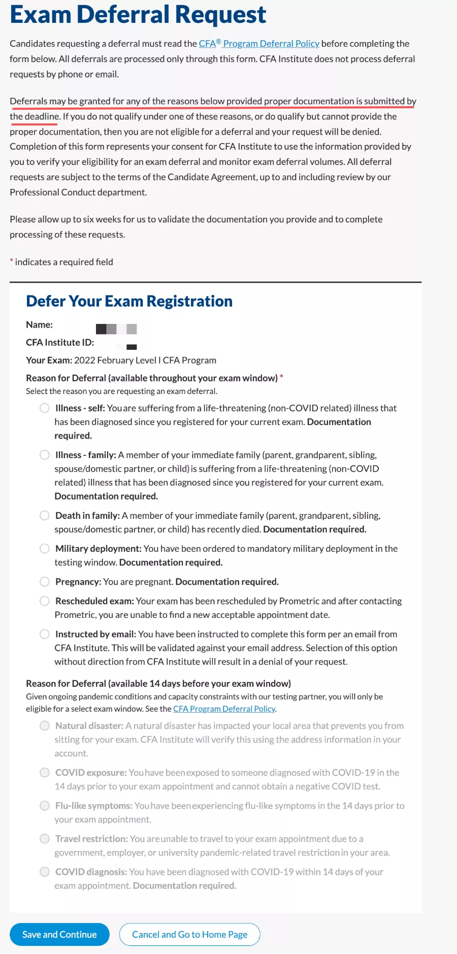 首先,目前協(xié)會(huì)是開(kāi)放了針對(duì)22年2月考期的延期申請(qǐng)通道(按照協(xié)會(huì)之前的說(shuō)法,每個(gè)考期的延期通道都會(huì)在考位重選截止日之后打開(kāi)),只有注冊(cè)報(bào)名了2月特許金融分析師CFA考試的考生才能申請(qǐng)。