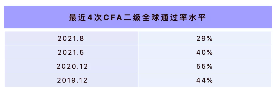 在紙考階段,CFA考試二級通過率一直都在45%左右,末代紙考達到了55%,這也是史無前例了,那進入機考階段后,眾所皆知,各級別通過率都走低,去年5月考期二級是降到40%,大家都覺得:嗯,這個降幅還是可以接受的。(大概是有一級通過率腰斬的事實做了鋪墊)