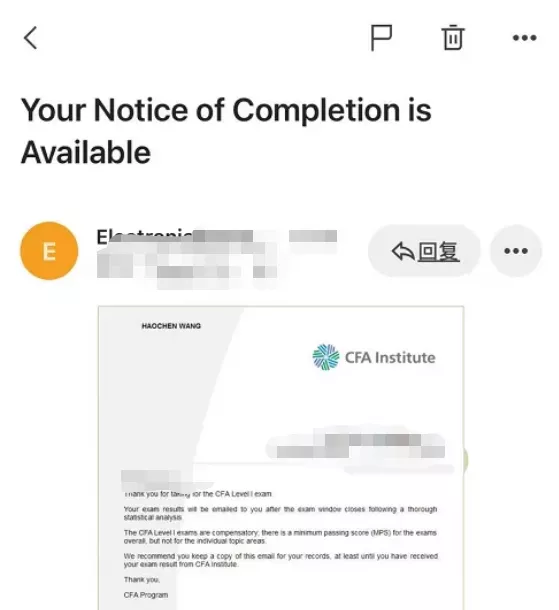 不知道大家是否還記得,剛考完時,收到了一封來自CFA協(xié)會的機考中心服務商prometric(普爾文)發(fā)過來的查成績郵件:Your Notice of Completion is Available(譯為:你的考試結果通知已送達)