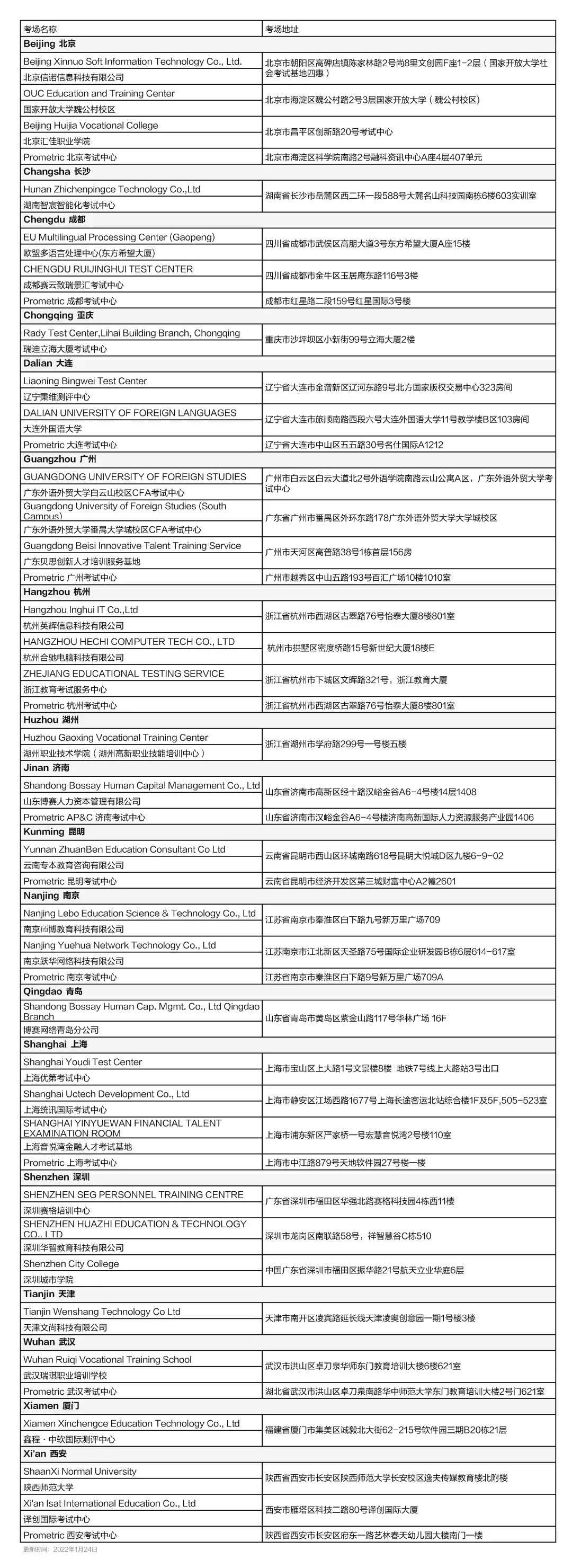 以上就是【2022年2月CFA 中國(guó)考場(chǎng)安排已公布!】的全部解答,上圖為CFA協(xié)會(huì)也發(fā)布的2月考場(chǎng)中英文地址大全,大家可以根據(jù)自己的考場(chǎng)對(duì)照查看一下。圖片比較大,想要獲取高清版本,大家可以咨詢金程網(wǎng)校。