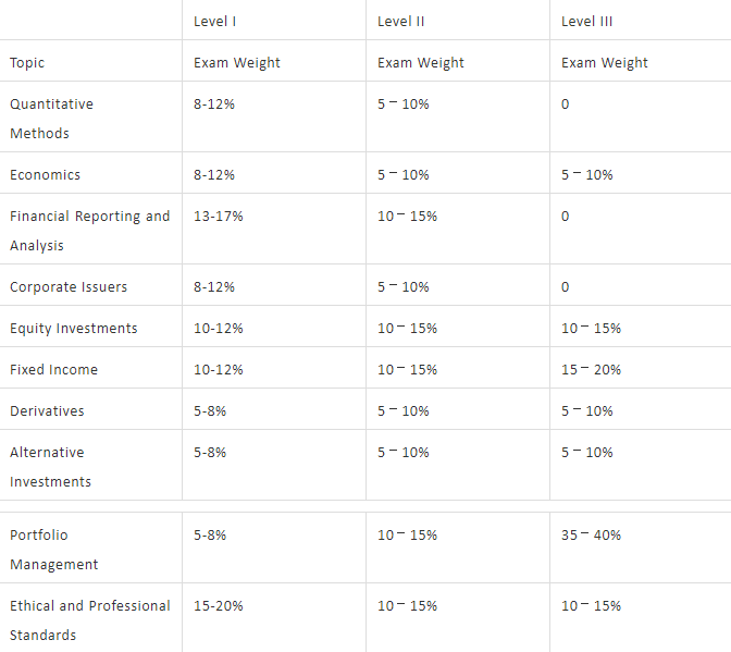 其中,CFA一級重點:偏重投資工具和基礎(chǔ)知識;一二級考試的科目權(quán)重是固定的,三級科目權(quán)重是變化的。
