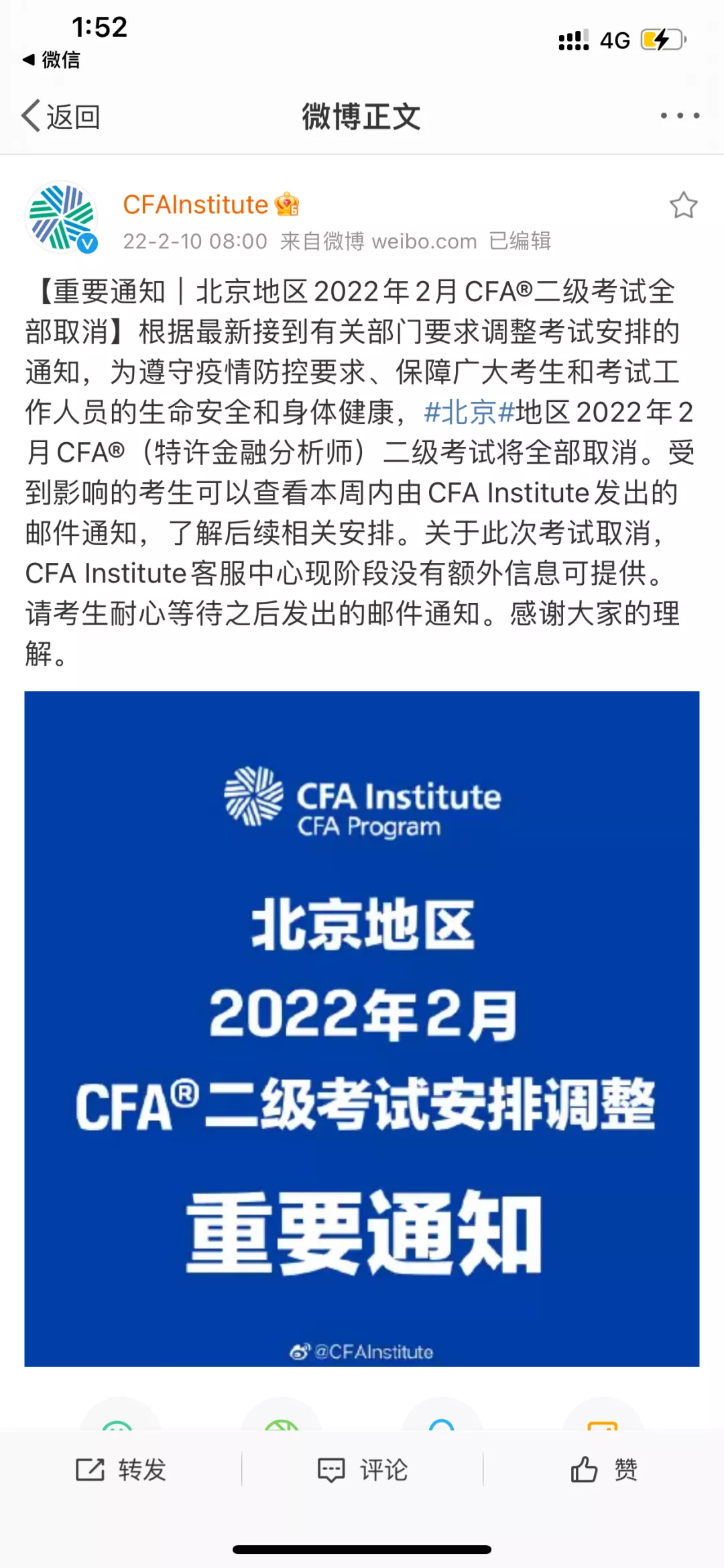 截止到目前,CFA考試北京2月考期是全面取消(一級二級、全部考場都被關(guān)閉了),也放上CFA協(xié)會(huì)的官宣截圖,具體如下。