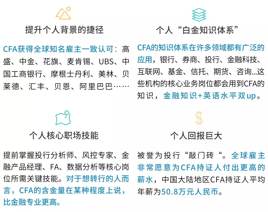 根據(jù)公開數(shù)據(jù),全球CFA持證人接近一半從事投資組合經(jīng)理、基金經(jīng)理、分析師的工作。在美國,23%的基金經(jīng)理都持有CFA證書,所以業(yè)內(nèi)人士稱CFA是“華爾街的入場券”。