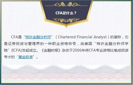 一直被視為金融投資界的MBA。是全球金融投資業(yè)里嚴(yán)格且含金量高的資格認(rèn)證,被稱為“金融第一考”的考試,為全球金融投資業(yè)在道德操守、專業(yè)標(biāo)準(zhǔn)及知識(shí)體系等方面設(shè)立了規(guī)范與標(biāo)準(zhǔn)。