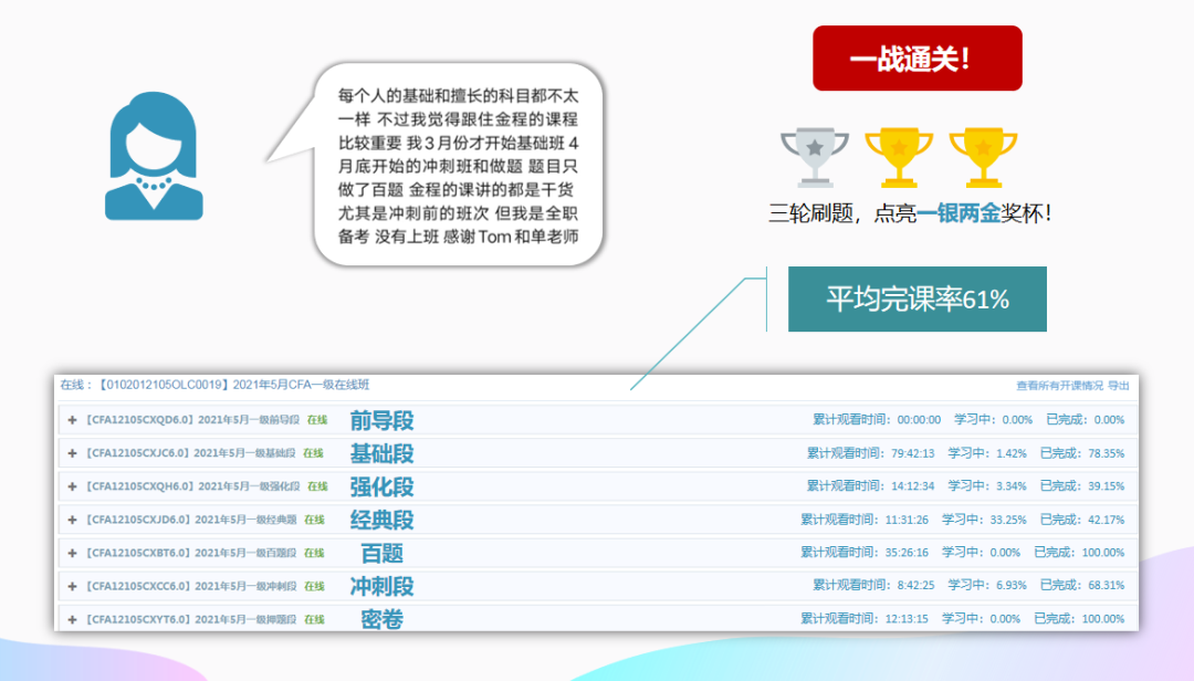 2022年CFA培訓(xùn)課程在哪領(lǐng)取?金程學(xué)員,備考2021年5月考期CFA一級,跟隨三刷***教學(xué)體系(非智課平臺),全優(yōu)通過一級考試。