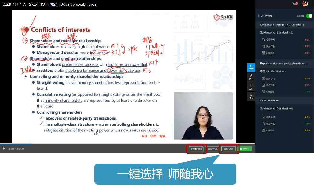 【基礎(chǔ)精講】100%貼合CFA考綱詳細講解,系統(tǒng)梳理知識點,不落下任何考點,A/B版兩套師資課程,隨心切換,省心學(xué)習(xí)/講授直擊考點,多角度加深理解。